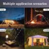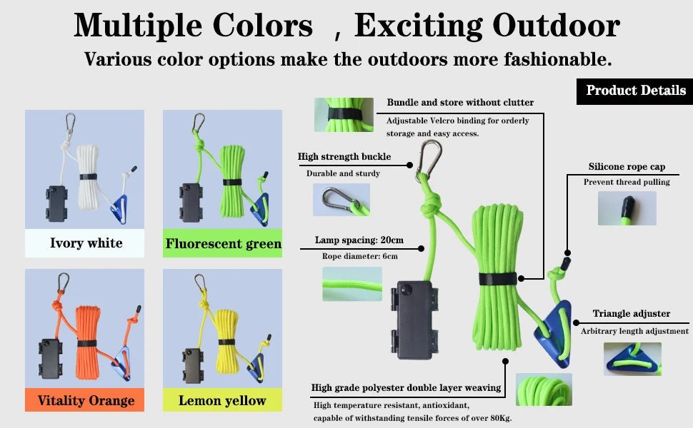 Ya sea que estés acampando en la montaña, en la playa o en el bosque, esta cuerda de luz LED es el complemento perfecto para disfrutar al máximo de tu tiempo al aire libre. No te arriesgues a quedarte a oscuras o con tu tienda de campaña mal asegurada. ¡Asegúrate de tener esta cuerda de luz en tu equipo de camping!