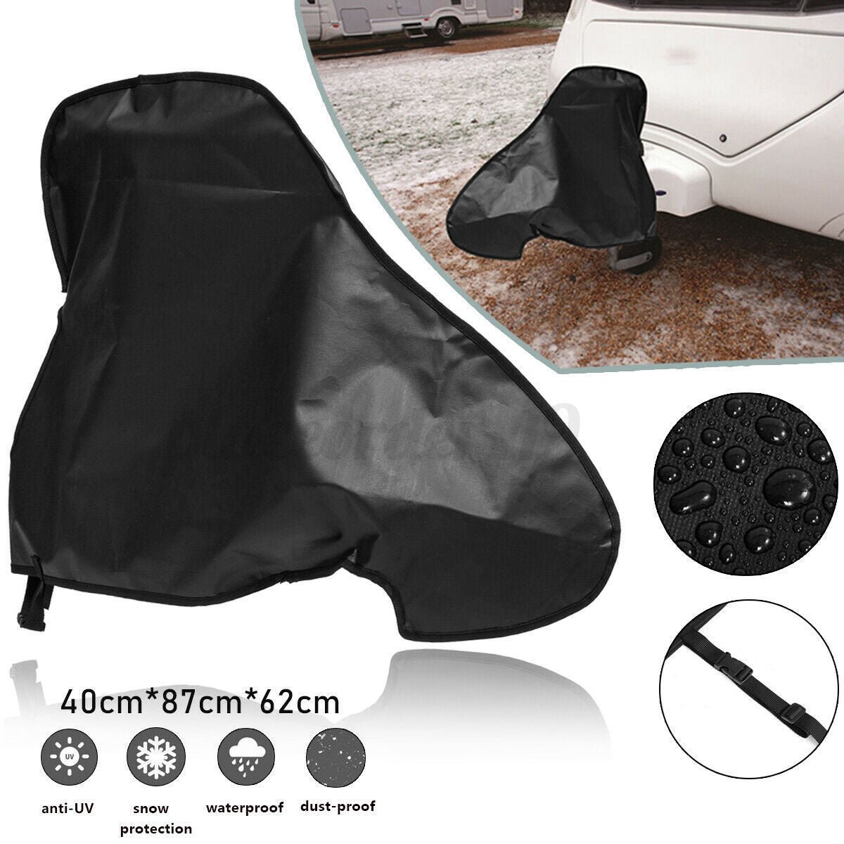 Diseño Inteligente y Versátil: Con un elegante color negro, esta funda no solo es funcional, sino también estéticamente agradable. Su tamaño de 40 x 87 x 62 cm la hace ideal para una variedad de usos, desde proteger el enganche de la caravana hasta cubrir otros equipos exteriores.